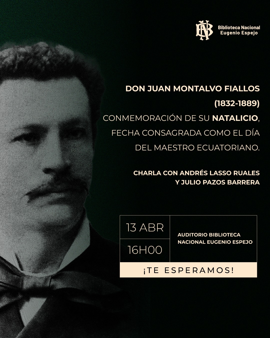 A partir de las 16h00, compartiremos una charla junto a Andrés Lasso Ruales y Julio Pazos Barrera, quienes nos acercarán a la vida y obra de Juan Montalvo Fiallos, en el marco de su natalicio y del Día del Maestro ecuatoriano 🇪🇨✨